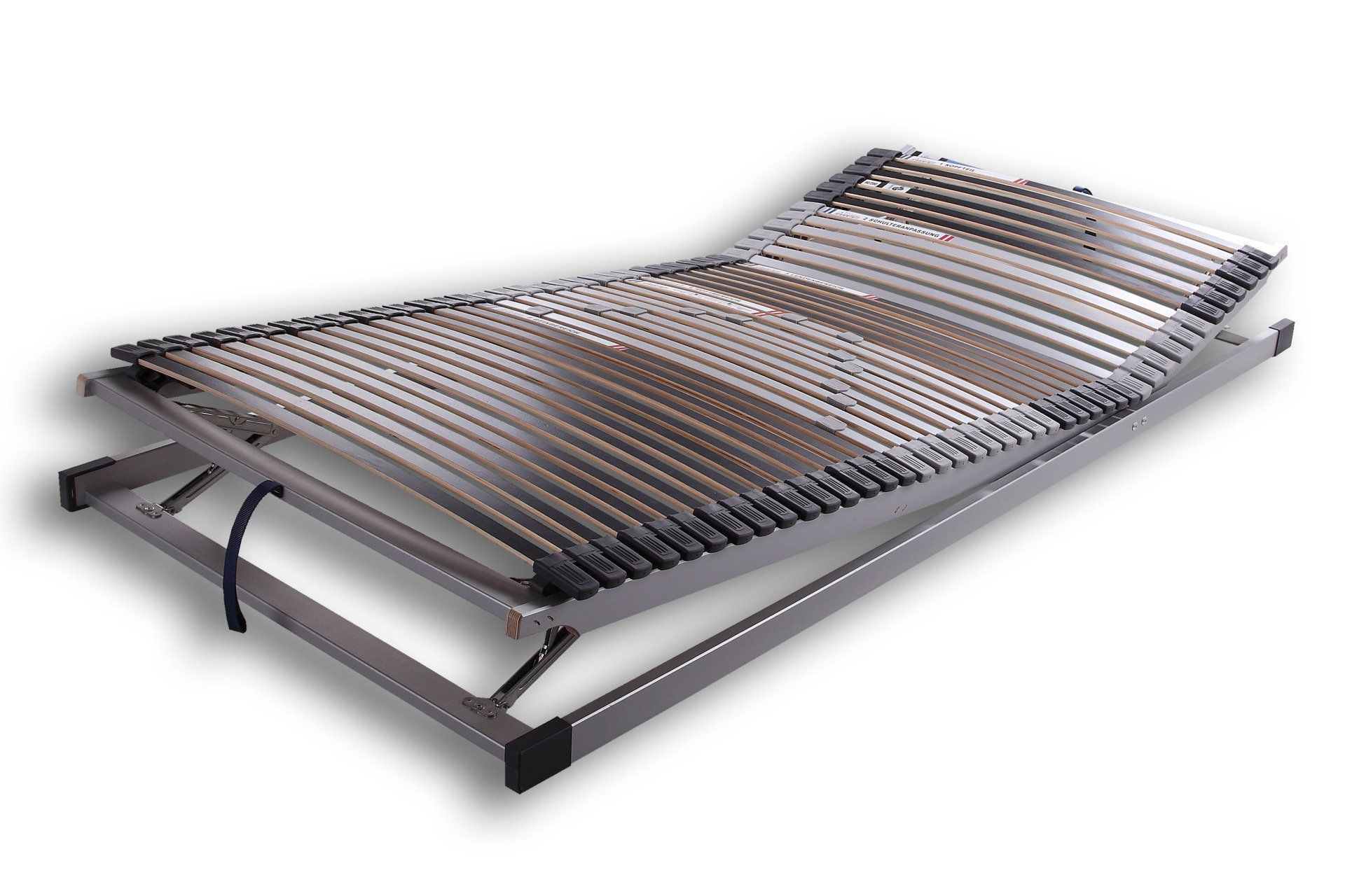 Stabiler Schichtholzrahmen "Malaga" aus dem Hause Breckle Weida mit 42 mehrfach verleimten Federholzleisten - Kopf- und Fußteil verstellbar. Lagerung der Leisten in beweglichen Trio-Kappen für eine flexible und geräuschlose Abfederung. Langkappen bis zur Rahmenaußenseite zur Vermeidung einer Besucherritze im Doppelbett (die Matratze liegt vollflächig auf). 6-fache Härtezonenverstellung durch Doppelleistentechnik. Durch den Mittelgurt wird eine optimale Druckverteilung und Stabilisierung erreicht. Für alle Matratzentypen geeignet.